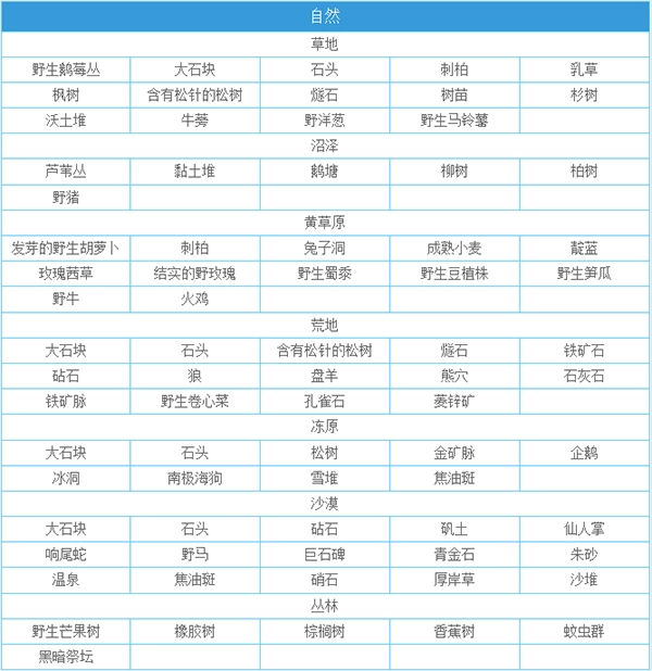 在游戏中自然环境是左右玩家生存的一个重要的关键点,一小时人生的游戏自然环境分布主要有七大部分,分别是草地,沼泽,黄草原,荒地,冻原,沙漠,丛林,那我们都来看看在这些地方都有什么可以提供合成,提供生存的资源吧!