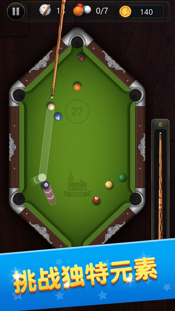 2、还原现实桌球玩法,配以真实物理参数,让广大桌球爱好者玩的得心应手,杆精利落。