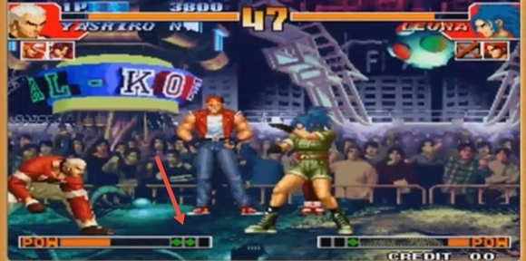 1、拳皇97爆气前必须拥有一个能量以上,能量就是绿色的圆点,如下图所示: