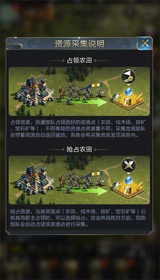 占领资源点是最为基础的玩法,也是我们对于资源点最为基础的处理方式。派遣部队前往资源进行采集资源,部队的构成和一般出兵基本一致,只是更加倾向于负重上,可以选择一些负重比较高的兵种出征,这样才能够尽可能多的收获资源,当然这还要收资源点本身的储量影响。采集需要一段时间才能完成,这取决于采集的效率,受科技、武将等因素影响,采集完成之后部队会自动携带资源返回我们的城池中。