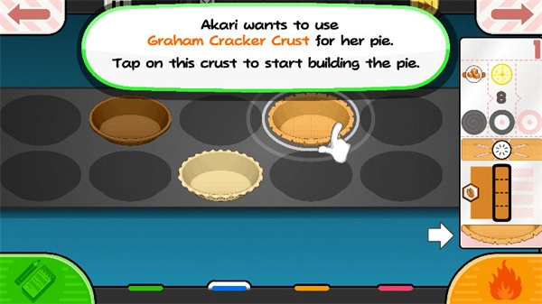 3、点选右下角的蓝色按钮即可开始制作阶段,在这个区域玩家可以选择适合的原材料、面糊形状以及烤焙方式,且画面的右侧会显示顾客的详细订单方便随时比对确保步骤无误。