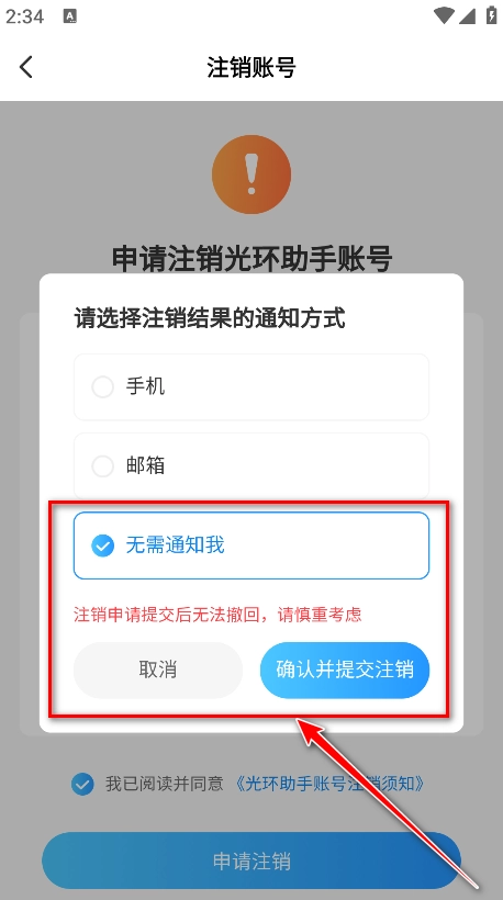 7、选择注销结果的通知方式,点击"确认并提交注销"。