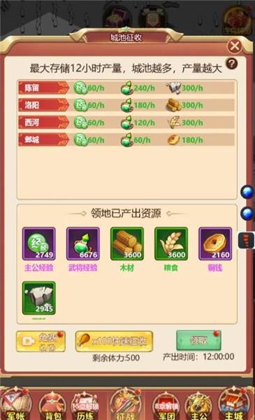 游戏核心资源产出地,通关能拿主公 / 武将经验、铜币,还有木、铁、石、粮四大基础资源。