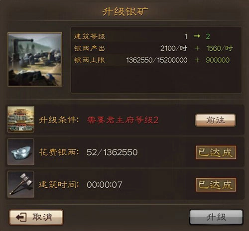 为什么把银矿和民居放在一起说呢,因为这两个建筑的功能很相似,银矿产出银子,民居产出民兵,他们的产出很稳定,无论你是主玩种田还是玩掠夺他人这种富有侵略性的玩,你都是要尽可能把银矿和民居升满。如果你追求极限收益,你要尽可能保持矿稿和征兵令的状态存在,因为他们直接提升银矿和民居的基础产量,重点是这两个物品很便宜而且参加活动也可以获取到!