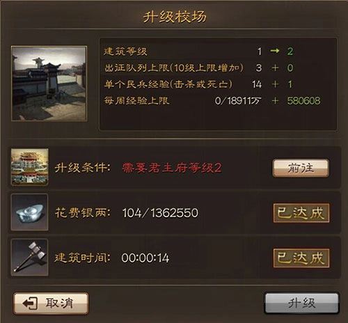 校场这个建筑其实就是存经验用的,但是万万不可忽略的一点!校场在特定等级的时候是可以提升出征队列上限的,出征队列多了,就可以同时对多个目标点进行发兵,极大的提升了效率,所以校场没必要每次都优先升级,可以把它放后面一点,一次性的升级,这个度怎么把握,就要靠各位看官自己了。