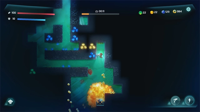 3、找到一个矿井(蓝色的深坑),潜入其中并开始挖掘以寻找资源。