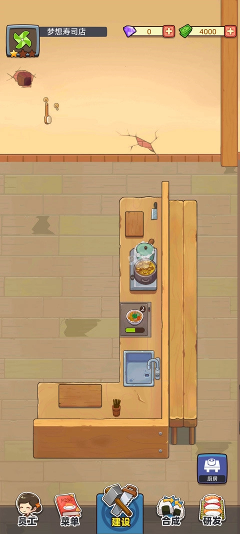 1、你突然接手以及奶奶留给你的一间看上去有些破旧的寿司店,你需要去仔细的打扫,装修,让这个店运行起来