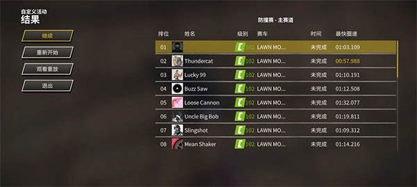 3、进入比赛,没多久大量对手就会自行撞毁,自己需要最少跑一圈,有单圈成绩,等AI全部撞毁或者只剩一两个时,自己撞毁自杀,就能取得靠前的名次,一场比赛在3分钟以内,一次30000~39000的经验,以及5000+的钱。