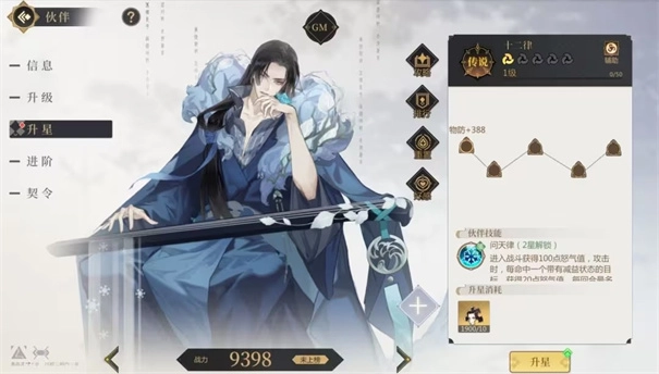 十二律:up池可获得,第一回合可出手,技能降低对方攻击,提高团队生存能力。2星被动问天律可配合孙兵、朱珠等提供减益效果伙伴,给自身恢复怒气,达到前1-3回合持续放技能的效果,3星后配合自身和队友提供的减益状态有一定概率冻结目标(无法行动,无法获得怒气);