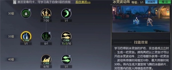技能学习方面,比较推荐各位玩家们使用水灵波动阵,35级解锁学习之后,可以获得冰连剑的庇佑攻击,可以造成冻伤,并且生成一把灵剑,之后对阵内范围内的敌人持续性造成伤害。