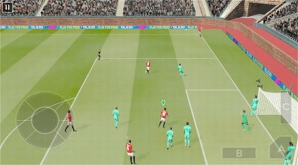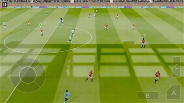 屏幕左下角设有虚拟摇杆,用于操控带球队员的移动方向。