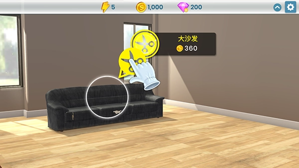 1、游戏启动后会有新手引导教程,点击剪刀图标就能对沙发进行改造;