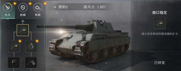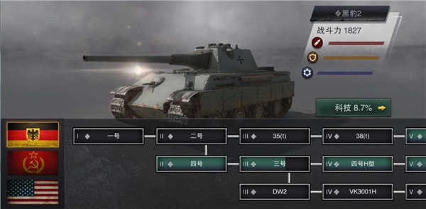 3、每辆坦克都有火力、防御与机动三项科技线,升级可提升战力。