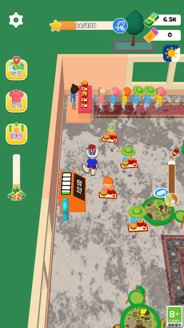 2、顾客就餐后产生垃圾,及时清理,满足顾客需求得额外奖励,积累口碑,解锁回头客,团体单等隐藏订单。