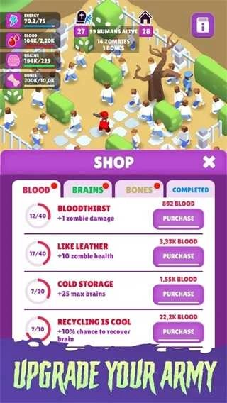 4、消灭城市中的人类可以获得血液、骨骼和大脑等资源,这些资源能够强化你的僵尸队伍。