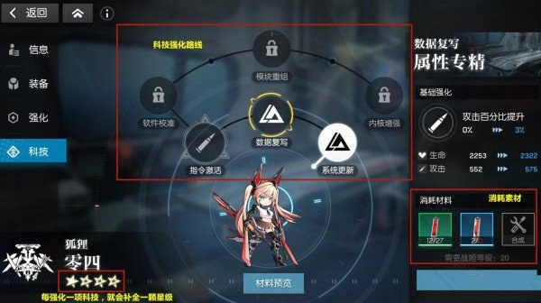 科技是战姬的升级系统,通过消耗特定素材为战姬解锁最多六次科技改造,每次改造都能提升战姬的对应属性,如下图所示: