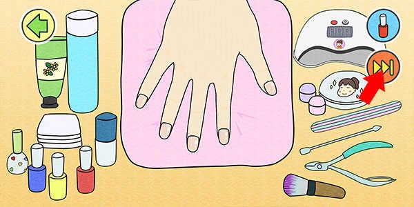 4、选定后进入美甲操作界面,按照提示使用工具完成手部护理步骤,右上角的快捷按钮可以帮助你快速跳过部分过程。