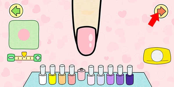 5、护理结束后,进入涂指甲油环节,选择喜欢的颜色进行涂抹。完成后点击右上角箭头进入下一步。