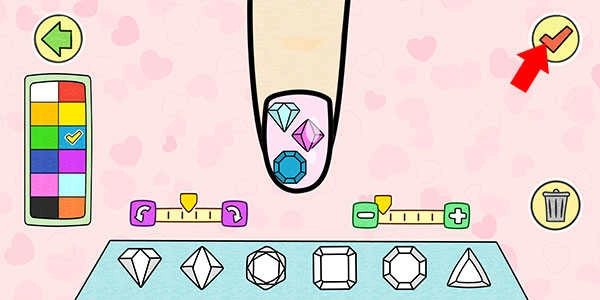 6、在装饰阶段,你可以通过点击添加装饰物,并用拖动调整位置,左侧进度条控制旋转角度,右侧进度条调整大小。完成后点击右上角确认按钮,返回整体界面继续装饰其他手指。