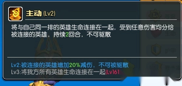 狮子游侠是被动技能可以为它回血和增加输出暴击,提高自身的生存和伤害,同时因为可以降低对方的回血,可以大大减轻清理对方前排肉盾的速度。狮子游侠适合放在1排,但是本身很脆皮,所以需要锚链来加强它的生存。