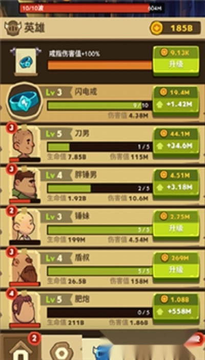 不断升级攻击,突破海关,杀死难度副本剧情boss,购买英雄,然后解锁更多的等级。
