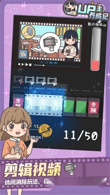 [回合制玩法]每天的精力和时间加起来那么多,要怎么好好利用来提升自己视频的质量,为自己带来更多的关注呢![有趣的视频制作]每条视频的主题和风格都任选,超多搭配组合,每种都有不一样的效果!加上永不过时的消除玩法,让每条视频的制作都充满乐趣![超多人物供你选择]五个等级、六个种类的角色可供选择。利用自己的努力来解锁更多的角色吧![超多随机事件和对话]无论是视频制作的过程中、外出收集素材,还是粉丝网友们的评价,都有海量随机事件和文本,每次都给你不一样的体会和惊喜![社交媒体管理和加入公司]在有了一定的粉丝量之后,你也可以开启自己的社交媒体和粉丝更加亲密的互动啦!更可以加入专业公司,在成为职业UP主的路上走的更远!