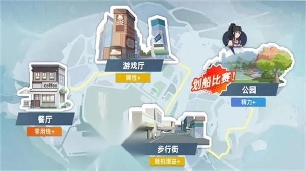 4、利用周末强化团队,扭蛋可花费零用钱提升属性;小游戏通过投篮得分增加能力;餐厅获取零用钱;公园通过划船等方式恢复精力并提升属性。