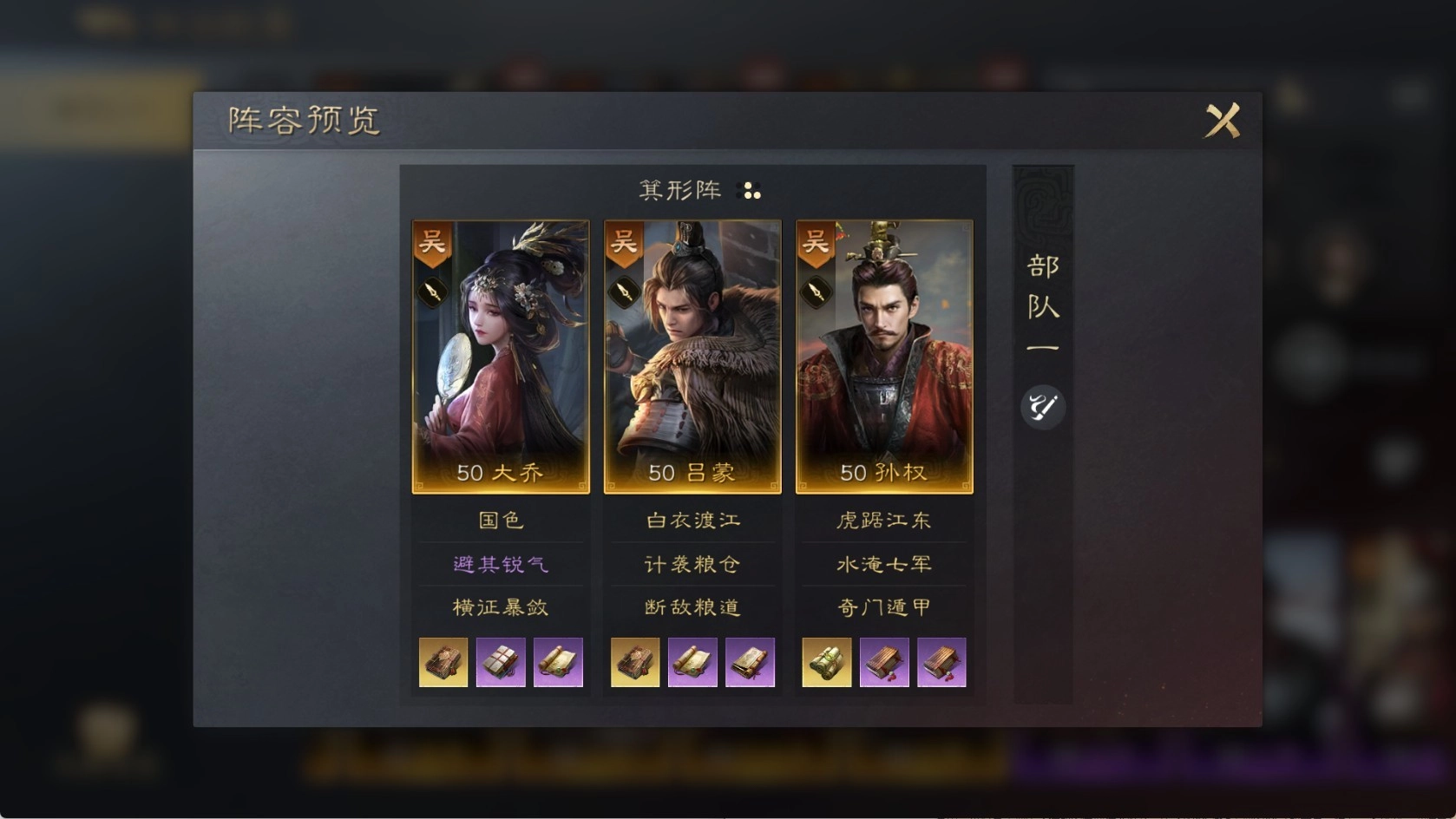 大乔、吕蒙、孙权这套阵容的主要核心是,对敌军施加各种异常状态来打控制,并且打出爆发伤害。“断粮”“技穷”等控制状态能够克制部分主动战法队和指挥战法队,但遇到速攻爆发队伍的时候会陷入劣势。