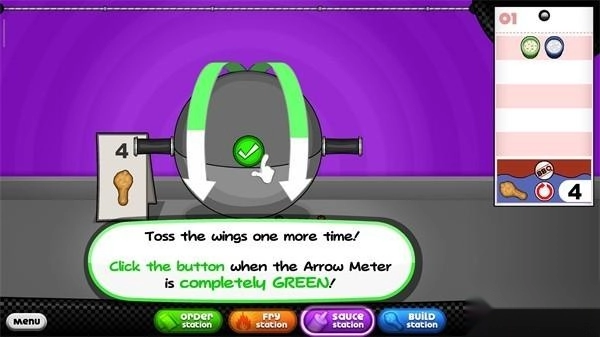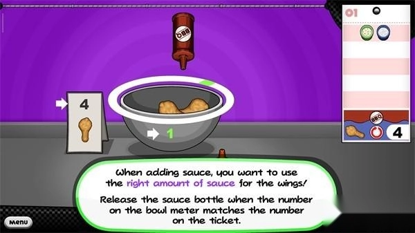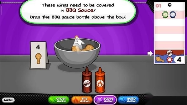 11、加酱汁的时候,你要用适量的酱汁蘸鸡翅上,当碗表上的数字与菜单上的数字相匹配时,释放酱汁瓶;