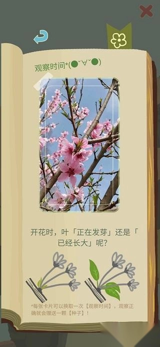2、点亭子,左边是种子卡片,可以选择观察种子,答题对了得到种子,答题错了给一壶水,中间的书是你所有的收集,右边的铲子是用来种种子的种子卡片答题界面,选择对应答案