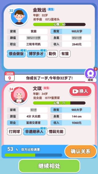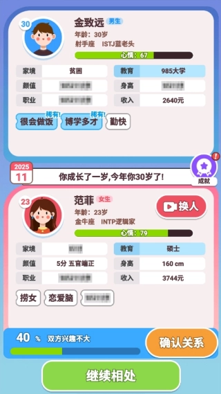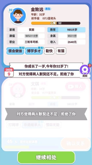 此外,游戏还设计了如相亲互动、家族延续等系统,模拟现实生活中可能面临的情境与长期关系变化,更加具有真实感。