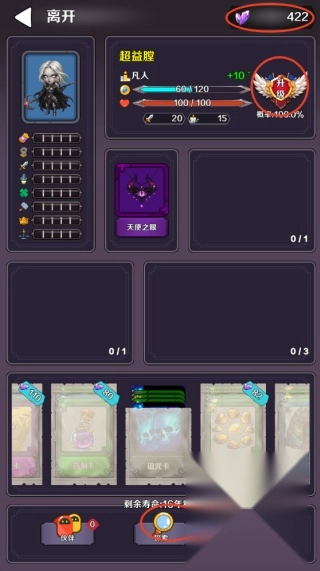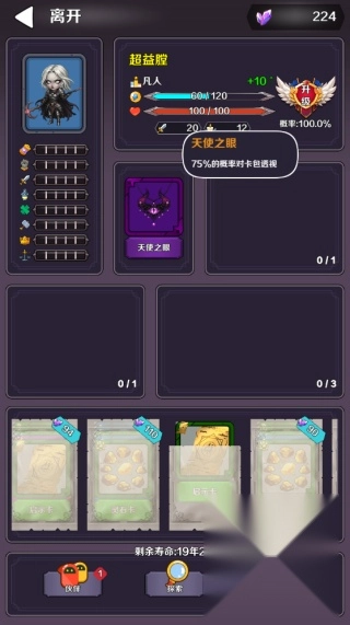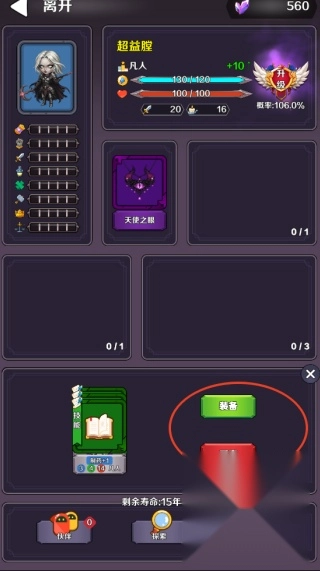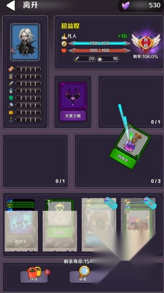 4、点击查看背包物品,卡牌技能可升级装备或丢弃。