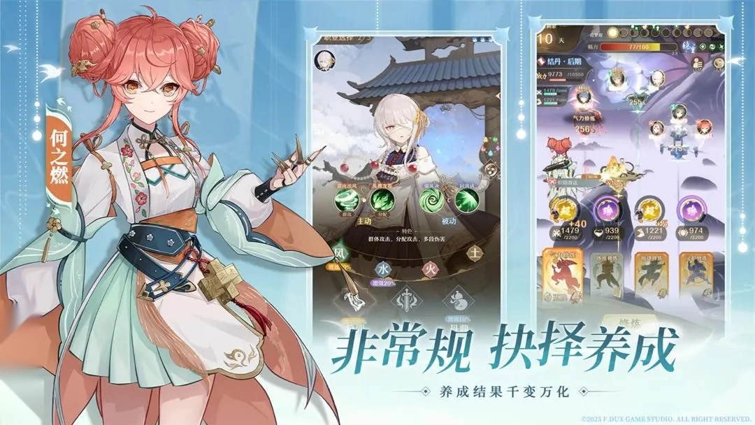 在元婴期前的开荒阶段,湘湘和何之燃能组成队伍的核心输出搭档,无论是单体还是群体伤害都能兼顾。前排可以安排一个用1个土丹或土剑(也就是渡坤,大家常叫坤坤)来承担伤害,接着补上李弈奕星。我个人倾向于走风符路线,这样既能保证输出又能兼顾防御,还能给后排套个小盾提供保护。