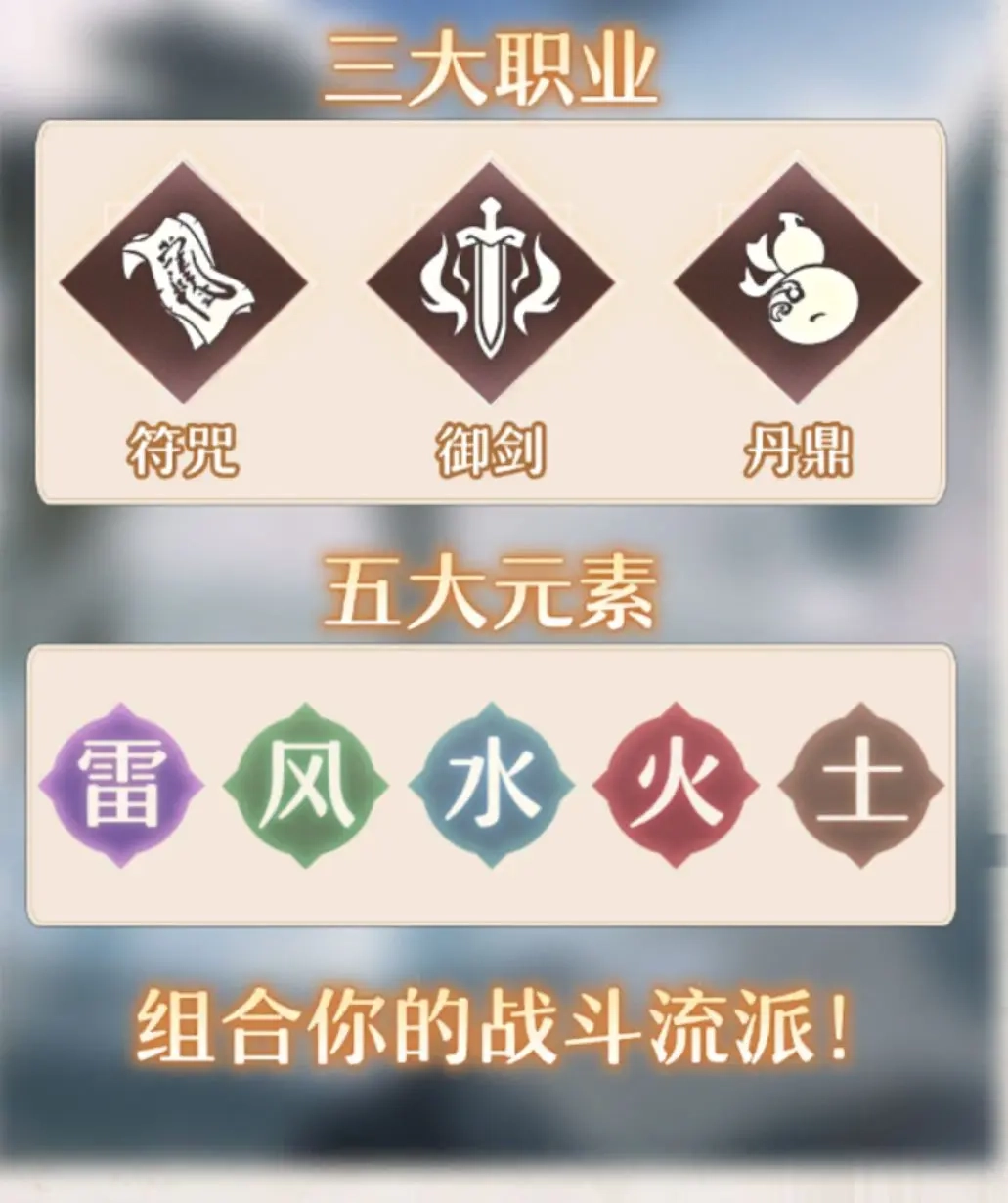 职业种类:符咒、御剑、丹鼎 属性种类:风、火、雷、水、土