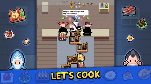 游戏画风是像素风,不但不显得粗糙,反而又透露出一种萌萌的感觉。客人角色设置很丰富,而且场景众多,增加了游戏的可玩性。展现你熟悉的烹饪技巧,经营自己的小店吧!