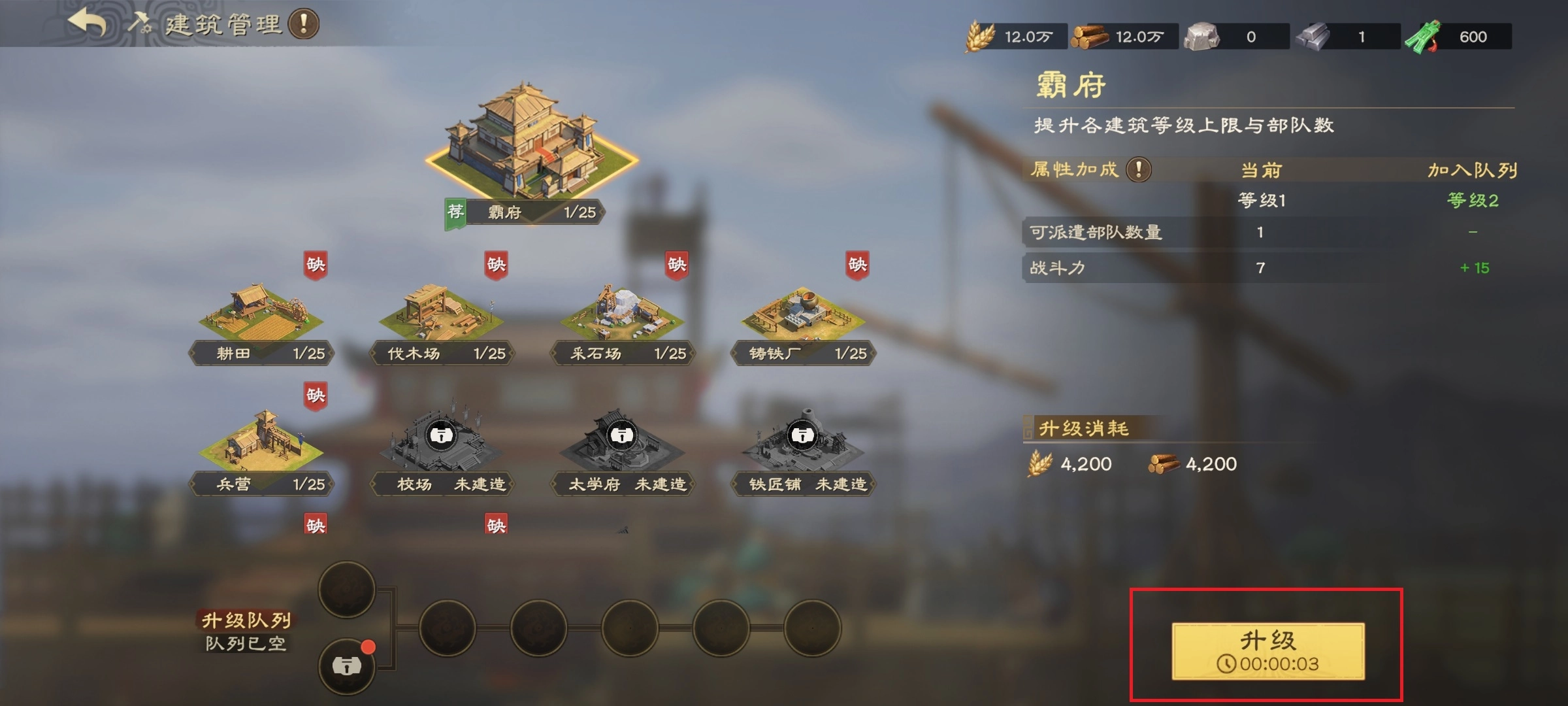 6、霸府是核心建筑,其他建筑等级受其限制。霸府达到5级、11级、17级时分别解锁新部队队列。首日冲至11级是关键节点,夜间可多一队列采集资源,建立领先优势。
