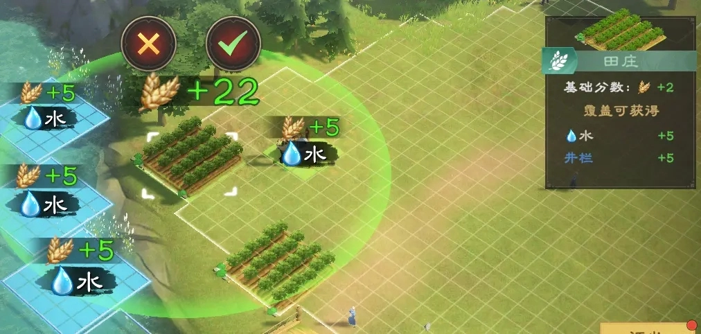 2、初级绿色建筑如村庄与伐木场需临近木材与水源才能获得加分。每块区域的水木资源分布固定。