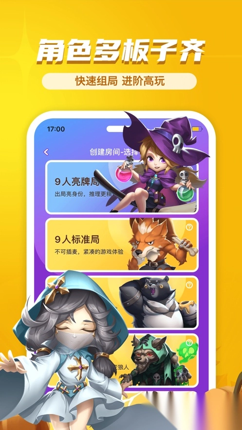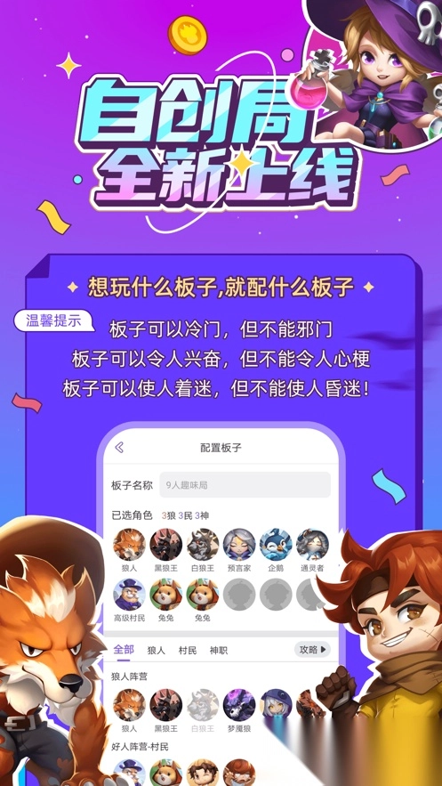 不仅包含经典预女猎9人局、12人守卫局,还有特色动物局、种狼局、鬼魂新娘局、名媛局、骑士局、白痴局、9人众神之战、12人通灵者、12人梦魇惑心、12人月灵局等多种玩法;发言时长、抢身份等选项均可自由调整;