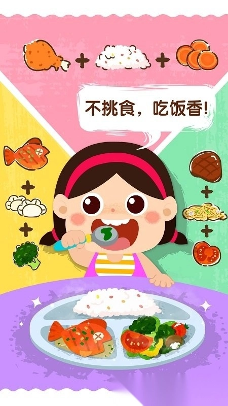 餐桌上摆满了美味食物,快来一起吃饭。米饭或面条,鱼肉或牛肉,西兰花或胡萝卜,样样都吃才能营养均衡,长得结实又健康。