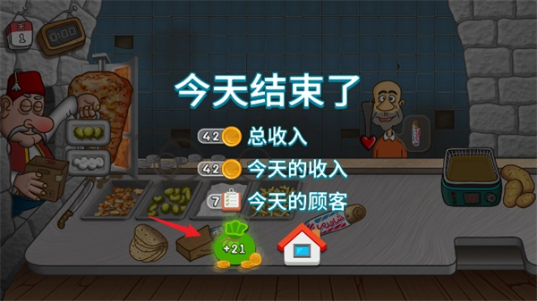 4、完成了一天的经营后,玩家们点击下方的绿色袋子也可以收取金币。