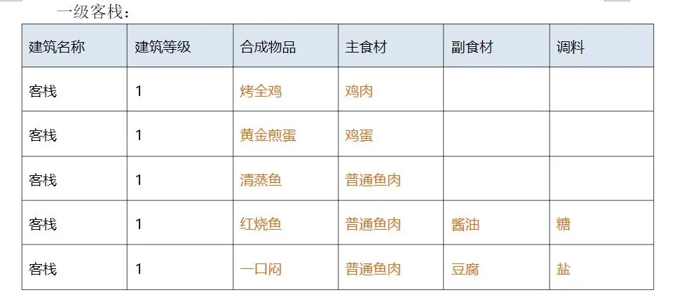 一级客栈的菜谱: