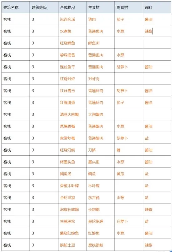 三级客栈菜谱: