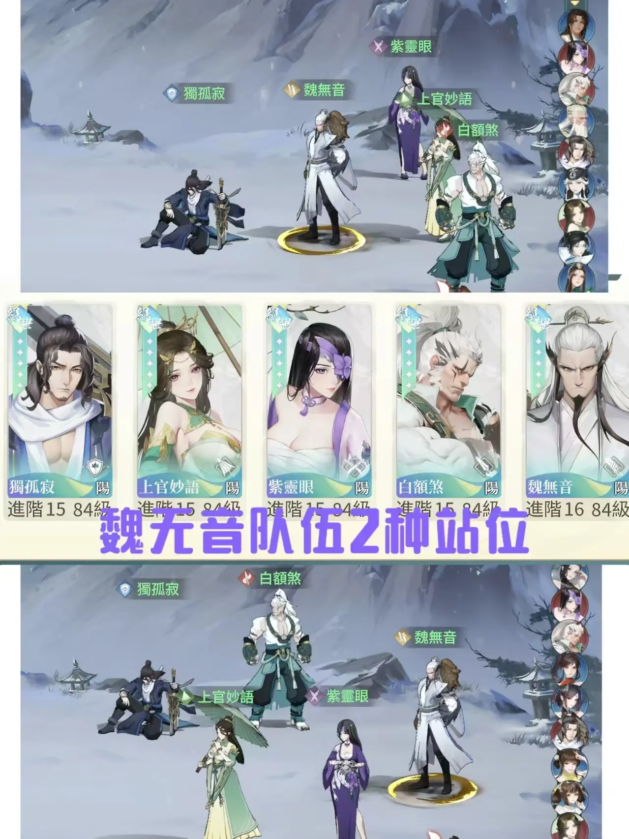 阵容核心是魏无音,他是群体输出核心,自身对携带负面效果侠客的高额暴击伤害进行群体压血,令敌方迅速减员。推荐器魂带藏锋、万劫、离垢,阵法用增加暴击和生存能力的都可以,推荐谪天和倦山。