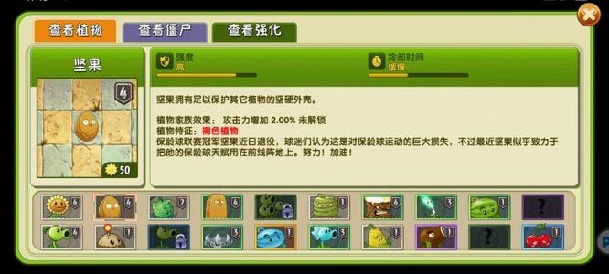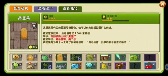 2、高坚果是广为人知的重型防御植物,能够有效阻挡僵尸的推进。植物家族效果:生命值提升2.00%。特性:可阻挡被抛掷的小鬼僵尸。植物特征:褐色、高个子的植物。