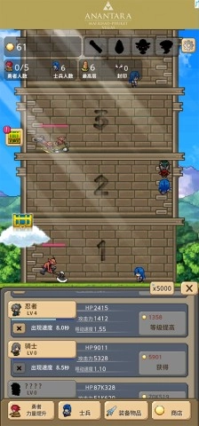 深入地牢,与各路勇者携手抵挡连绵不绝的妖怪攻势;收集并强化千种装备,大幅提高清怪效率与生存能力;解锁丰富的职业技能与被动天赋,自由搭配专属战斗流派;探索结构宏大、机关遍布的立体塔楼,每层地图都有独特机制与隐藏奖励;支持英雄自动扫荡(200层后开启),离线也能稳定获得经验、金币与稀有材料;实时查看士兵攻击状态与数值反馈,让每一次升级决策都有依据。