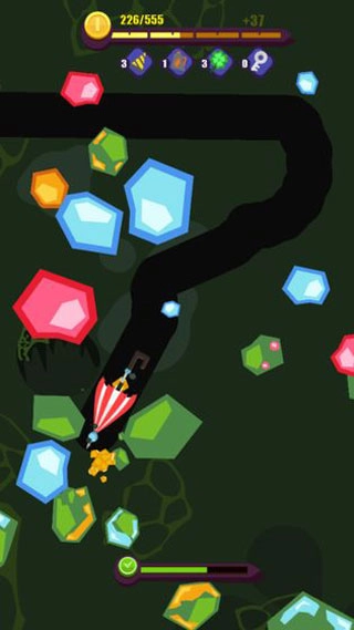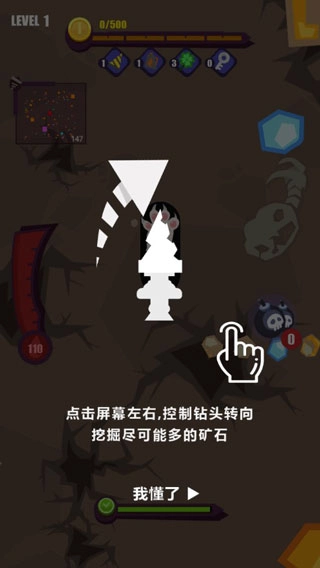 1. 通过点击屏幕左右两侧,操控钻头改变转向,从而挖掘到更多的钻石。