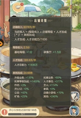 3、其他加成 = 升级业务+拓展业务+拓展等级加成+人才委任+作坊+艺人+开心52+家具+公会+店铺小+矿场+其他(鱼摊、旧物),通过对应玩法可获得收入提升