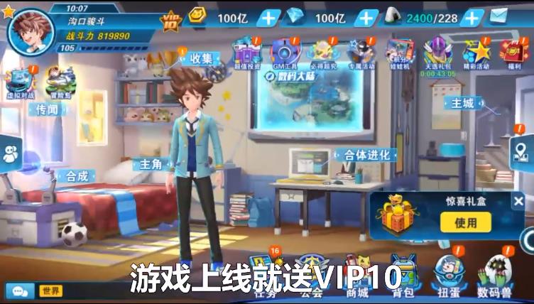 ★创建角色就送VIP10,还有GM刷充特权、专属礼盒*1、1元真充卡*1000以及战斗暴龙兽(究极体)*1