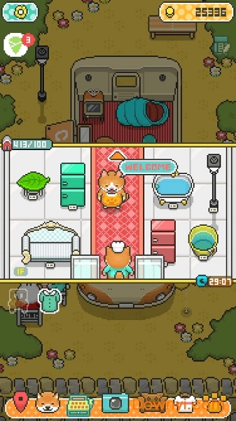 这是一段以可爱柴犬为核心元素的像素风格游戏,玩家能操控这只萌犬经营一家主题餐厅。在打理店铺之外,还可以指挥狗狗去探索冒险,收集各类材料,持续升级优化餐厅的布局与设施。