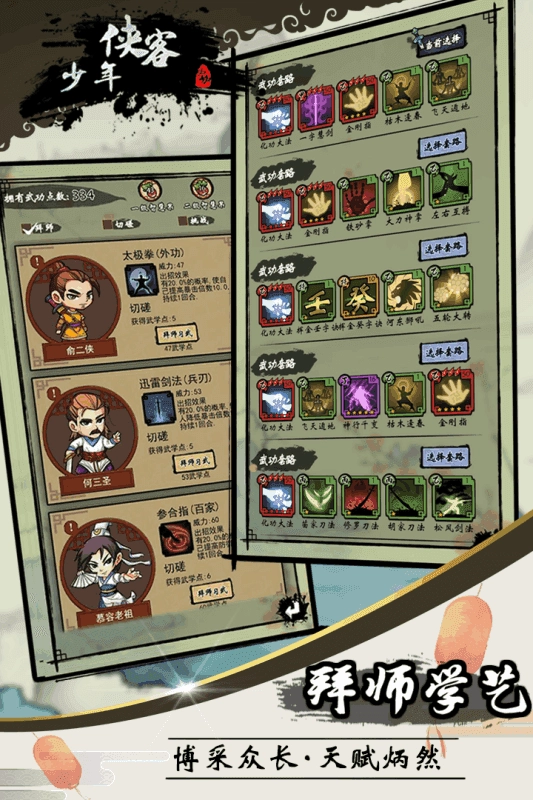 少年侠客是一款武侠题材的放置挂机点击RPG游戏,核心玩法围绕武功展开。玩家需要挑战宗师,成功后拜师学习武功,再运用不同的武功套路去挑战各路武林高手,逐步成长为独步武林的大侠!是不是很惊喜、很意外,内心充满期待呢?这是一款创意十足、诚意满满的武侠游戏,期待你的体验!